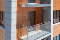 Propuesta con paneles ligeros de color y balconada de cristal.